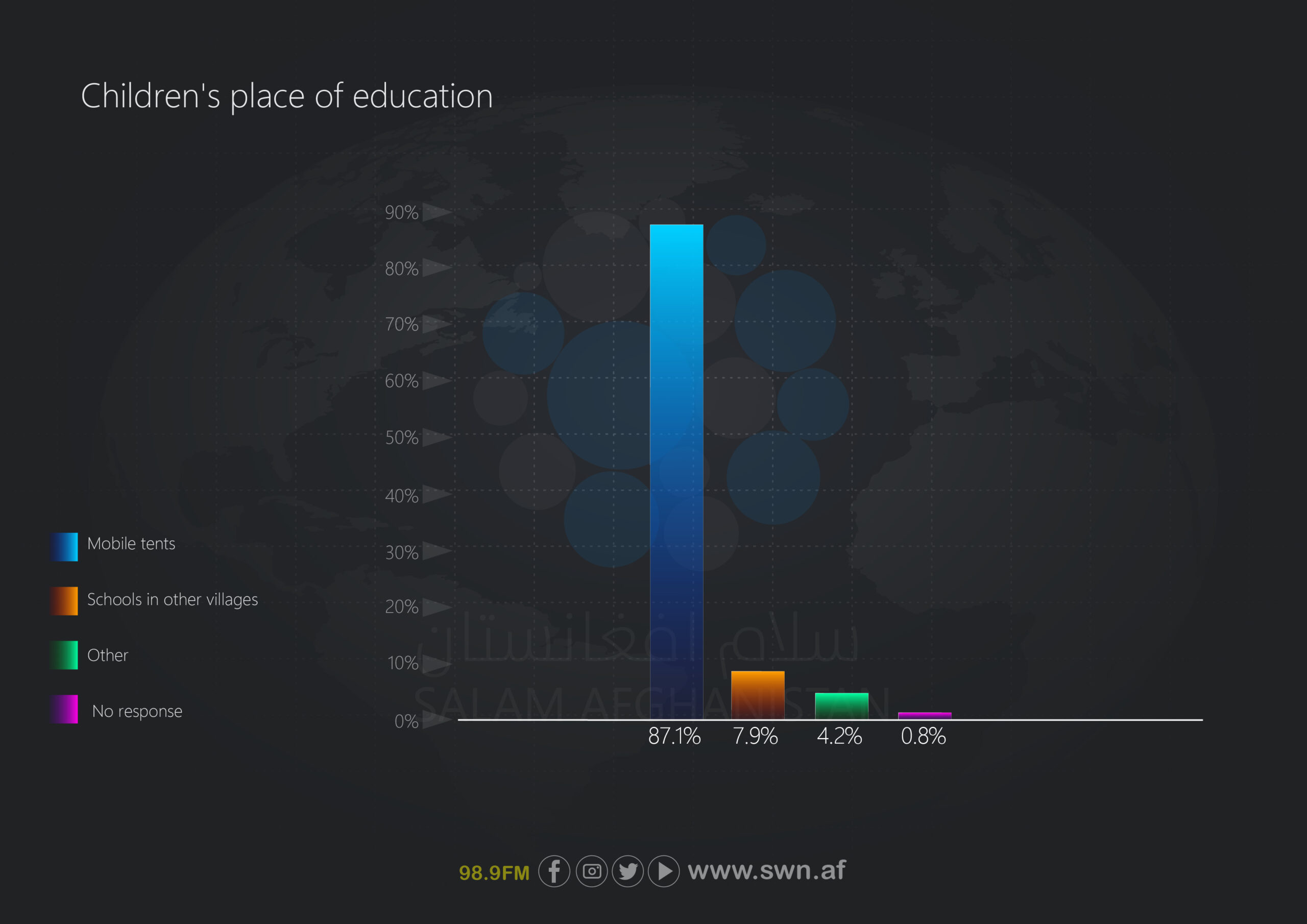 The majority of children (924 individuals, 87.1%) were receiving education in temporary tents. A total of 84 children (7.9%) attended schools in other villages.