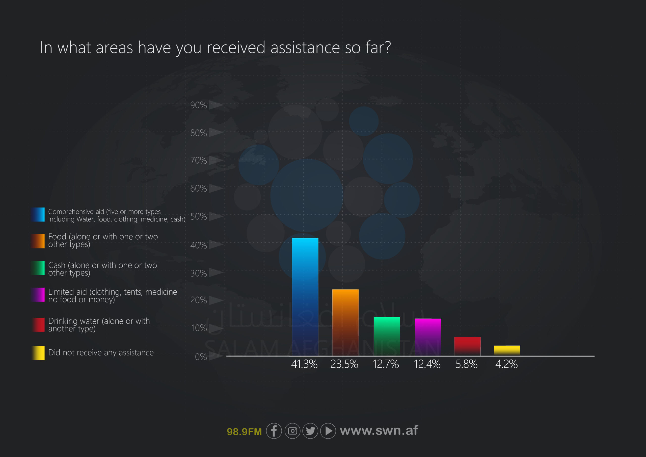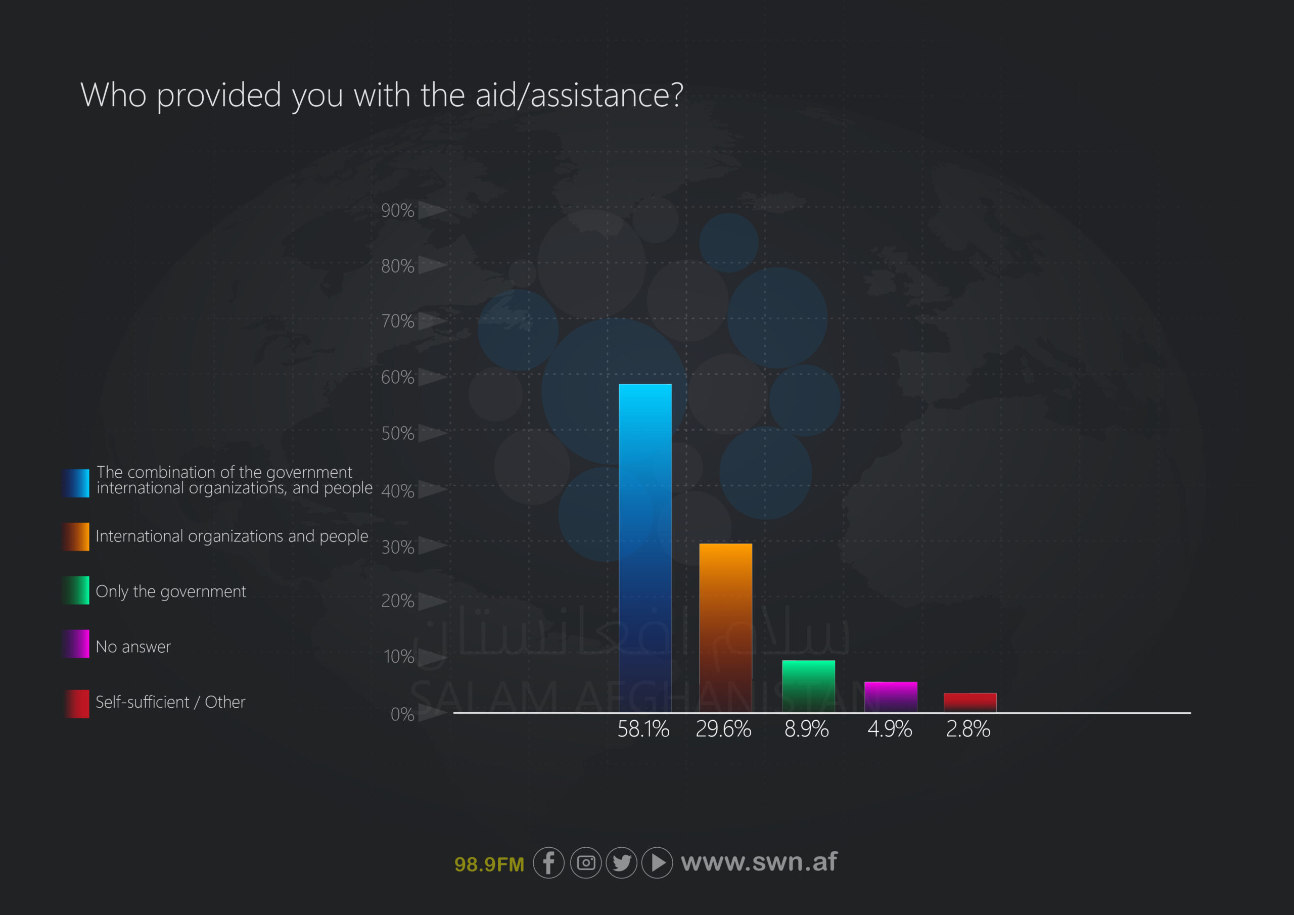 The majority of aid came from a combination of the Afghan government, international organizations, and the local community (616 respondents, 58.1%). A total of 314 respondents (29.6%) received assistance from international organizations and the community, while 94 respondents (8.9%) received aid solely from the government.