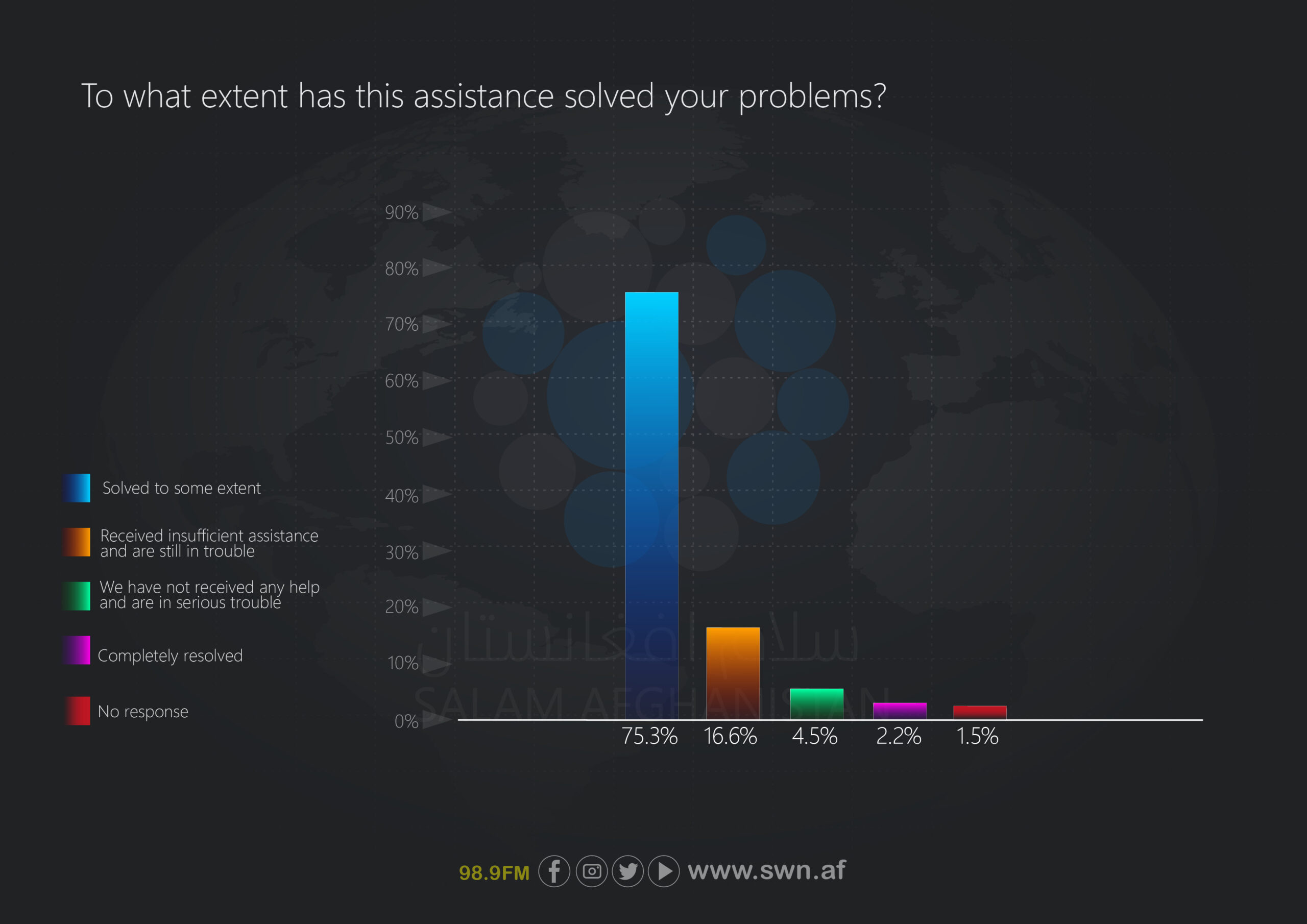 The majority of respondents (799 individuals, 75.3%) stated that the aid partially addressed their problems. A total of 176 respondents (16.6%) reported that, despite receiving aid, they were still facing significant difficulties, and 47 respondents (4.5%) had received no assistance and were in severe distress. Only 23 respondents (2.2%) reported that their problems had been fully resolved.