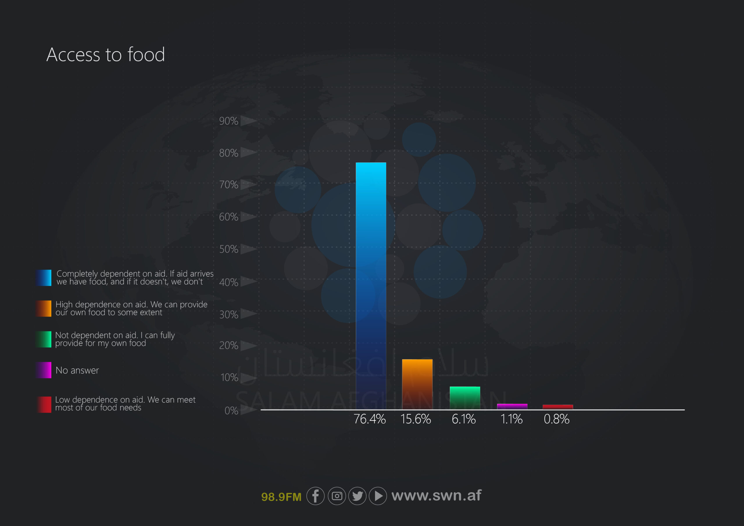 Dependence on aid was very high. A total of 811 respondents (76.4%) were entirely dependent on assistance—they had food only when aid was delivered. Another 165 respondents (15.6%) were largely dependent but could partially provide for themselves. Only 65 respondents (6.1%) were fully self-sufficient.
