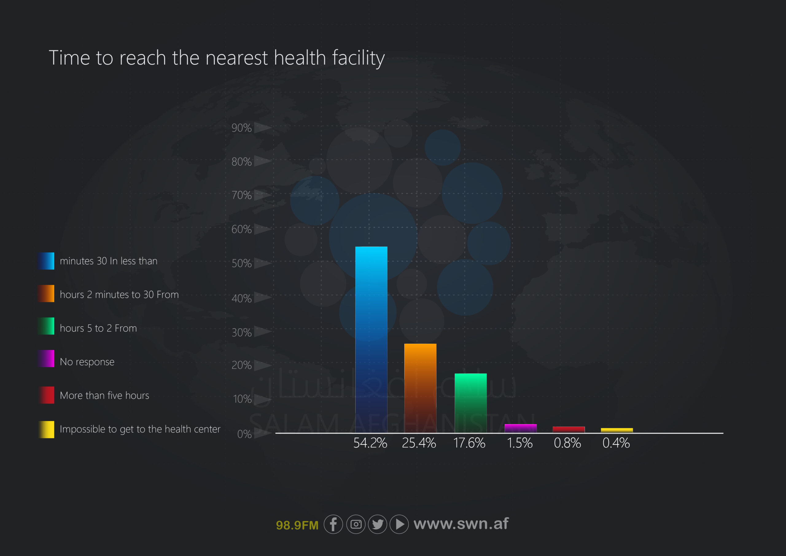 Most respondents (575 individuals, 54.2%) could reach a healthcare center in less than 30 minutes. A total of 270 individuals (25.4%) required 30 minutes to 2 hours, and 187 individuals (17.6%) needed 2 to 5 hours to reach a healthcare facility.