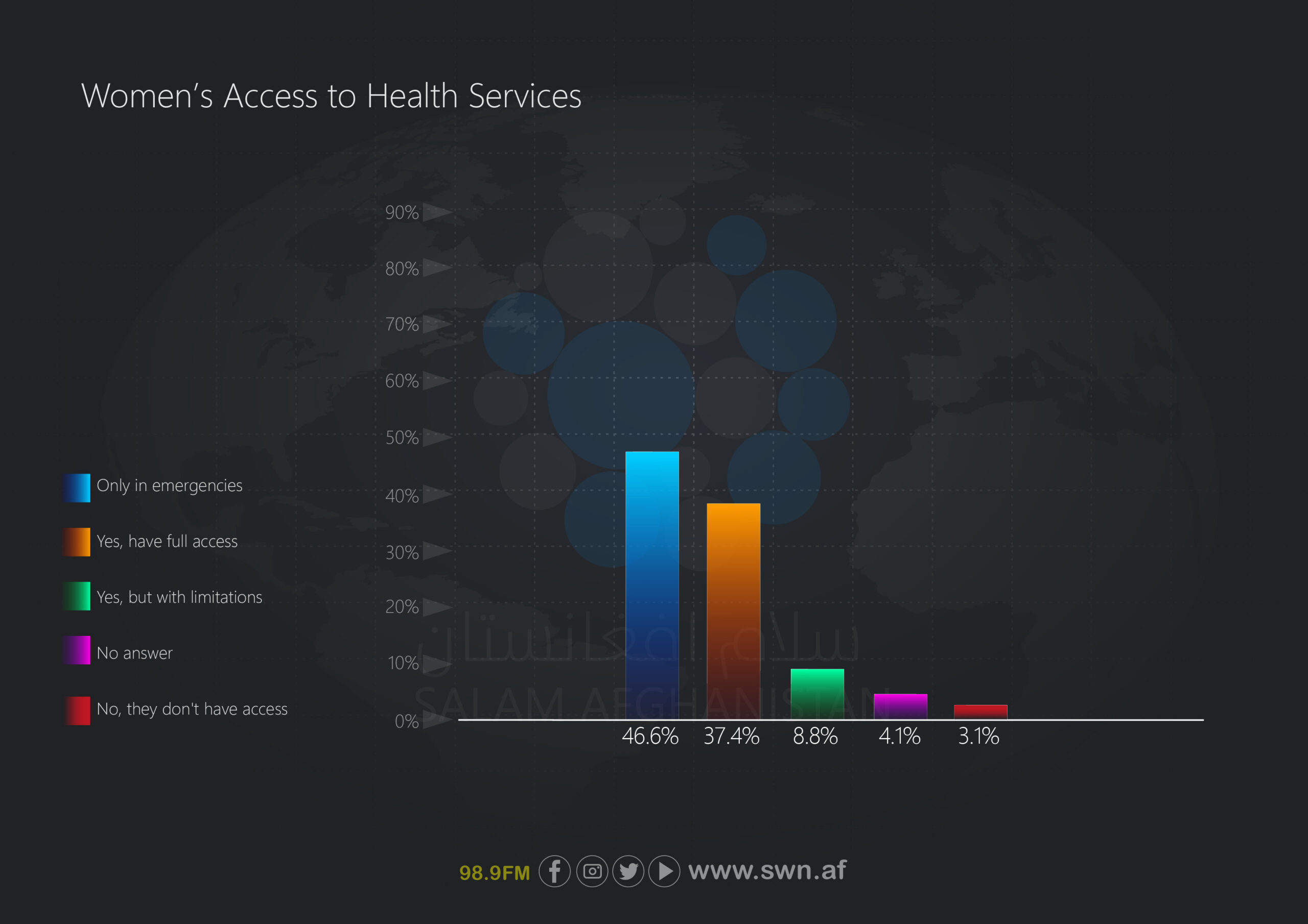 Nearly half of the respondents (494 individuals, 46.6%) reported that women could access healthcare services only in emergencies. A total of 397 individuals (37.4%) reported full access, 93 individuals (8.8%) had limited access, and 33 individuals (3.1%) had no access at all.