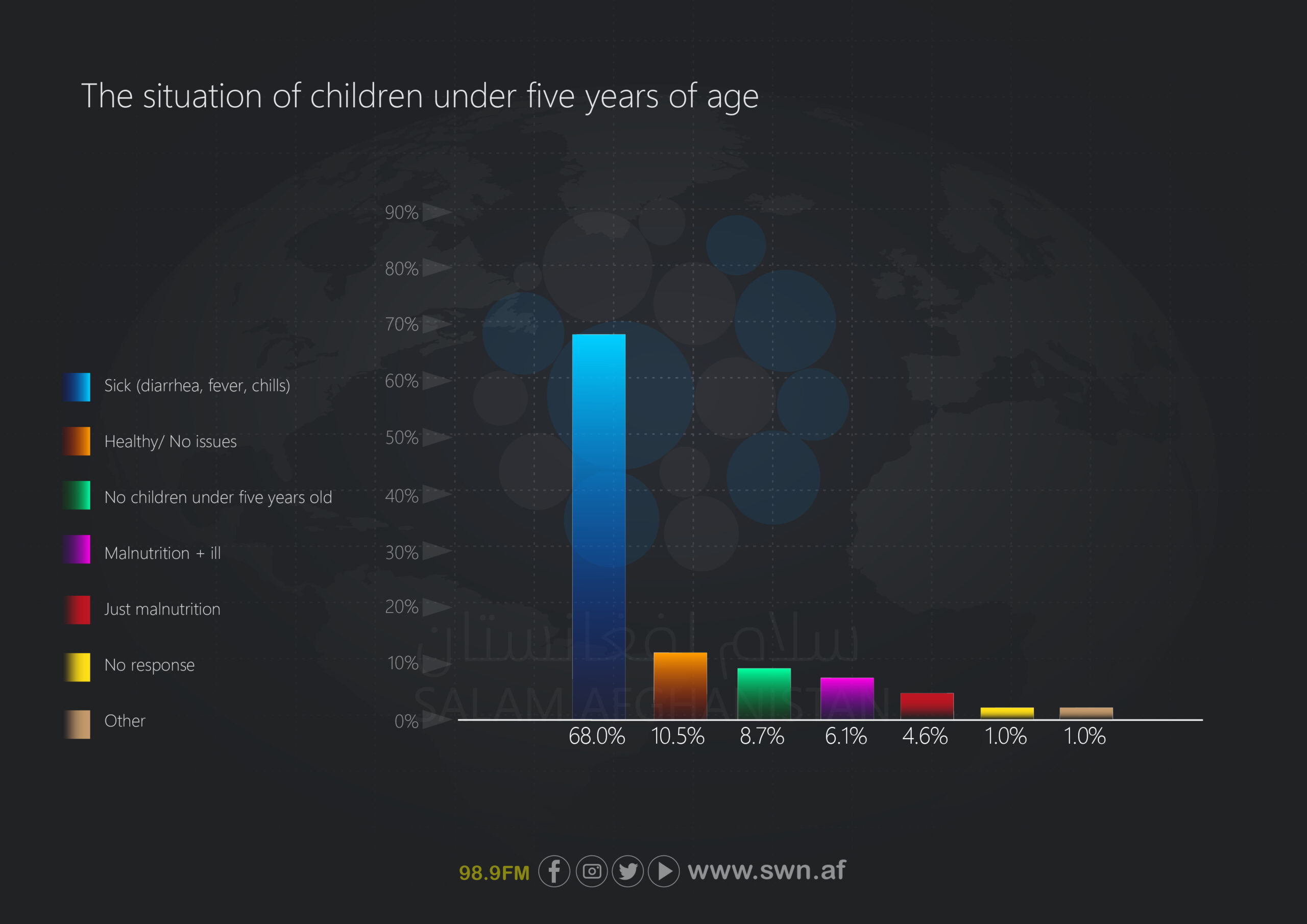 Most children were ill (722 individuals, 68.0%), suffering from diarrhea, fever, and chills. A total of 65 children (6.1%) experienced both malnutrition and illness, and 49 children (4.6%) suffered from malnutrition only. Only 111 children (10.5%) were reported as healthy.