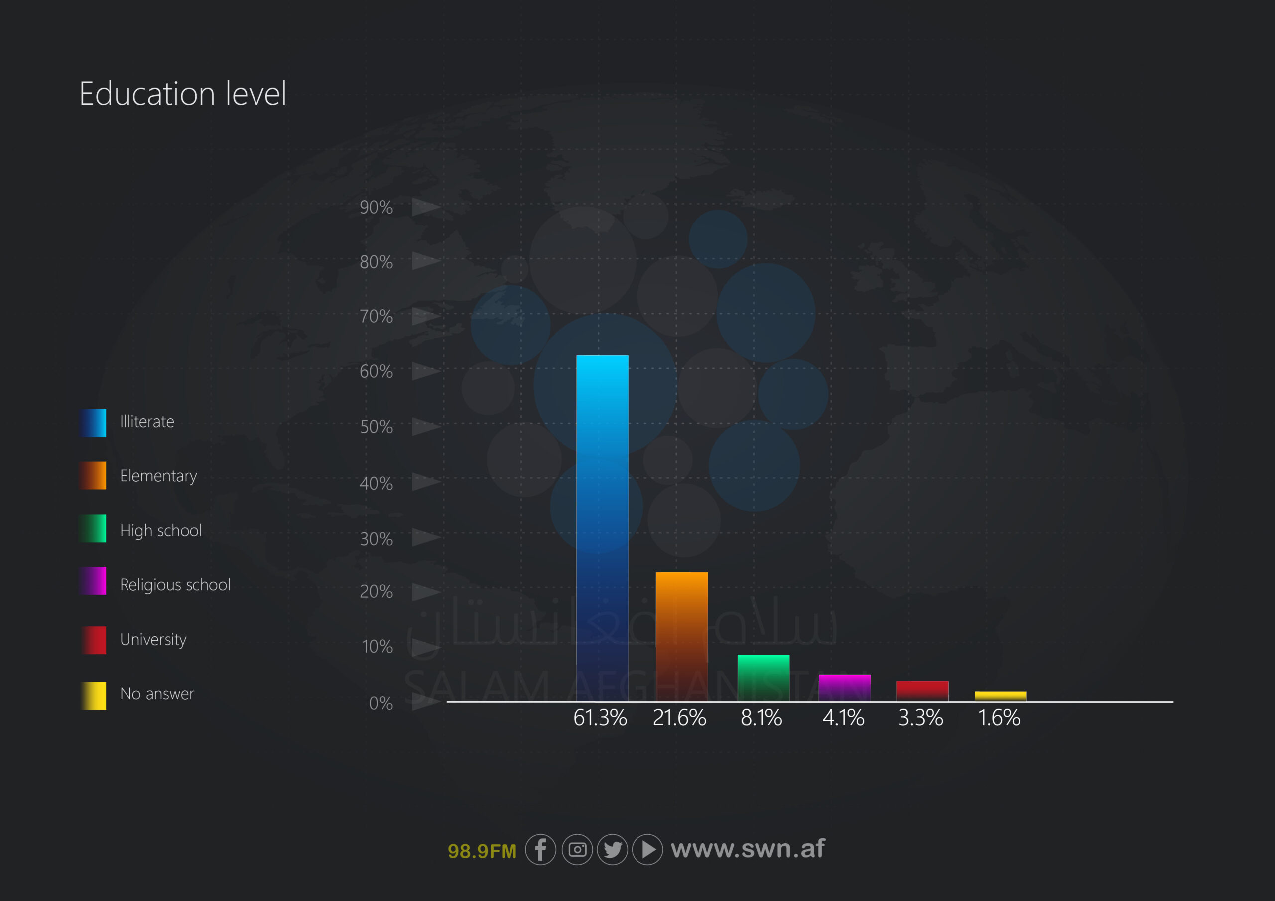 Most respondents were illiterate, accounting for 650 individuals (61.3%). Among the remaining participants, 229 (21.6%) had completed primary education, 86 (8.1%) had finished high school, 44 (4.1%) attended religious schools, and only 35 (3.3%) had higher education.