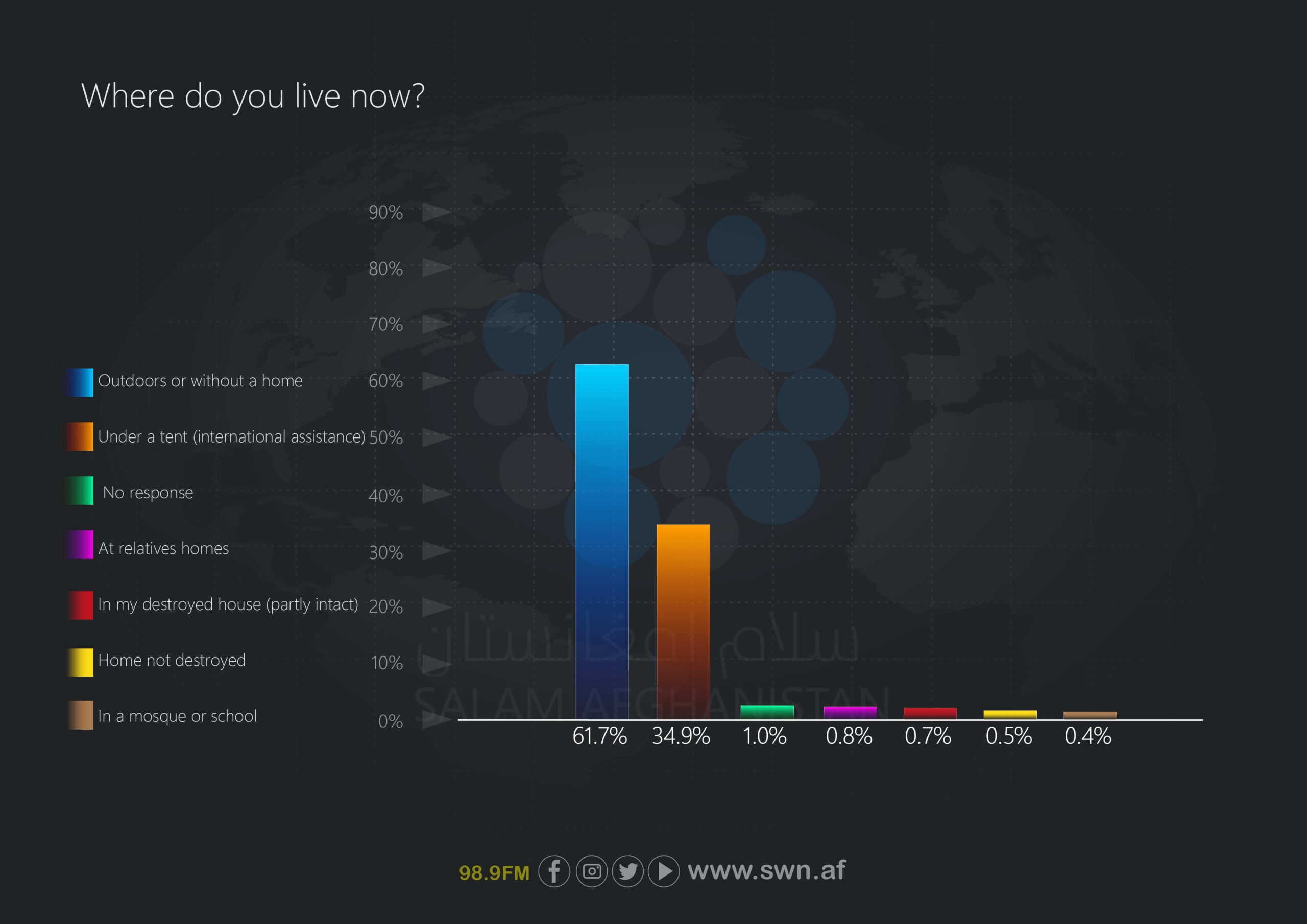 This survey, conducted by the Salam Afghanistan Media Institute (Radio Salam Watandar), involved 1,061 families affected by the Kunar earthquake in Sawkai district. The respondents were overwhelmingly men (99.5%), with low literacy levels (61.3% illiterate), and mainly engaged in agriculture and livestock farming (32.6%). About 13.2% of families reported at least one death, and 42.9% had injured members, of whom 25.5% suffered serious injuries. The main causes of death were being trapped under debris or falling from heights. Displacement was widespread, with 92.4% of families forced to leave their homes—67.1% temporarily and 25.3% permanently. Currently, 61.7% live outdoors without shelter, and 34.9% reside in temporary tents. Additionally, 77.6% of families lost all their homes and property.