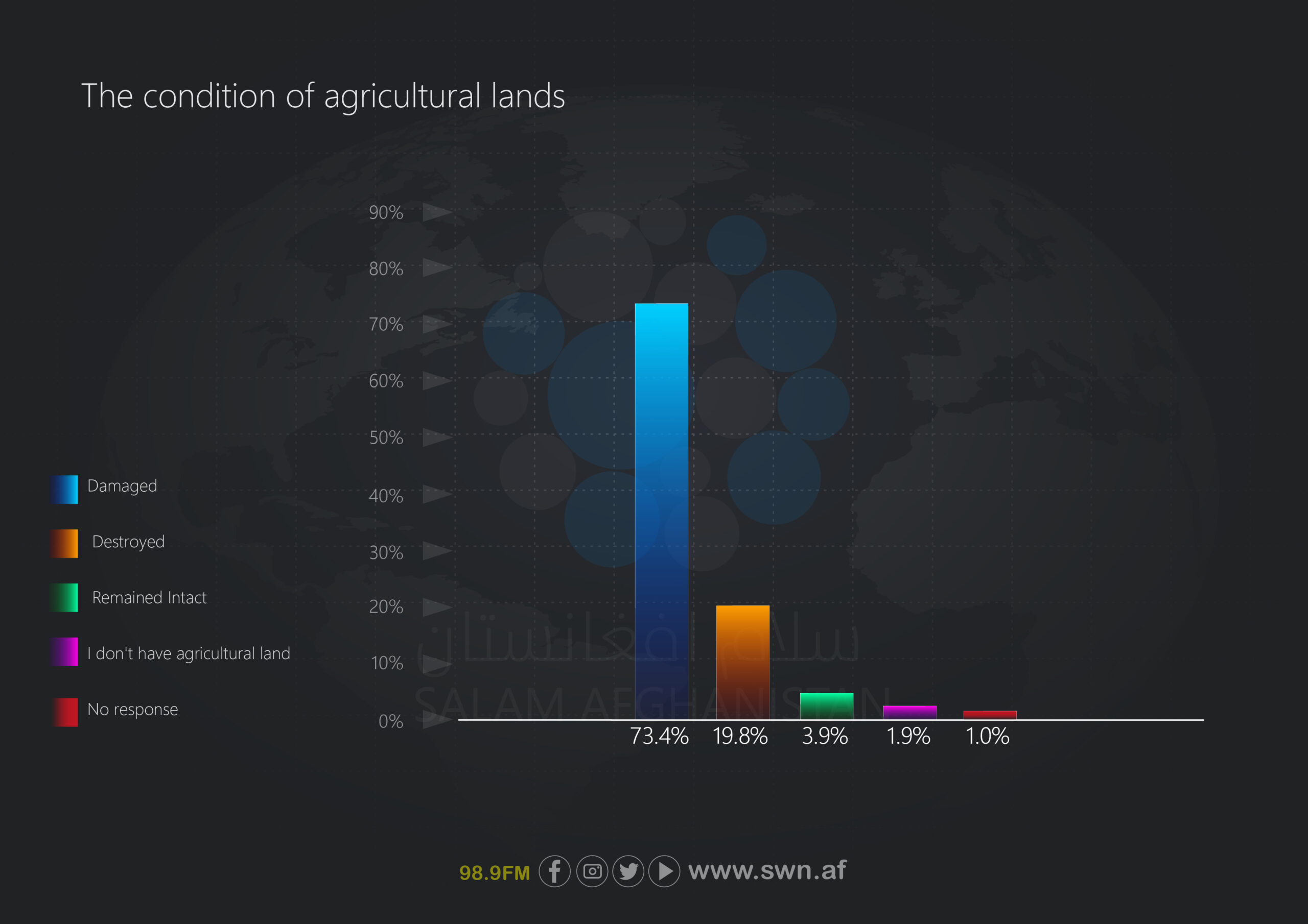 The agricultural situation was catastrophic. A total of 779 respondents (73.4%) reported that their land was partially destroyed, and 210 respondents (19.8%) reported that their land was completely lost. Only 41 respondents (3.9%) reported that their land remained intact.