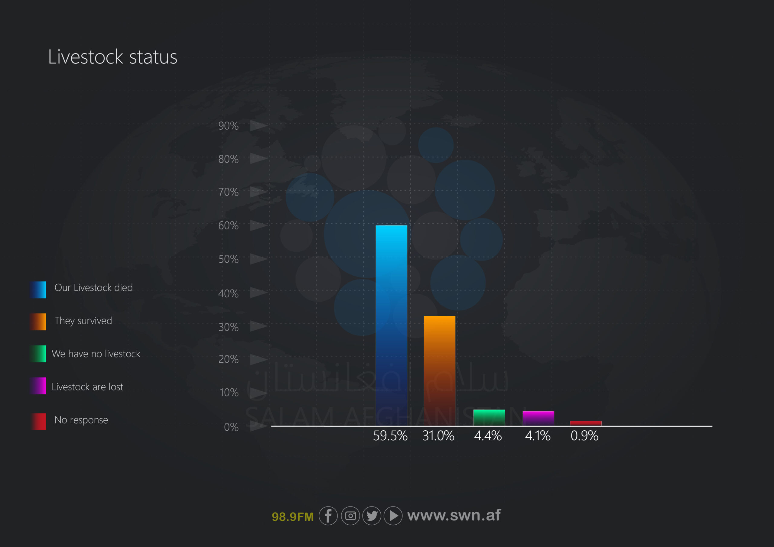 Most livestock perished, with 631 respondents (59.5%) reporting losses. A total of 329 respondents (31.0%) reported having healthy livestock, 44 respondents (4.1%) reported missing livestock, and 47 respondents (4.4%) did not own any livestock.