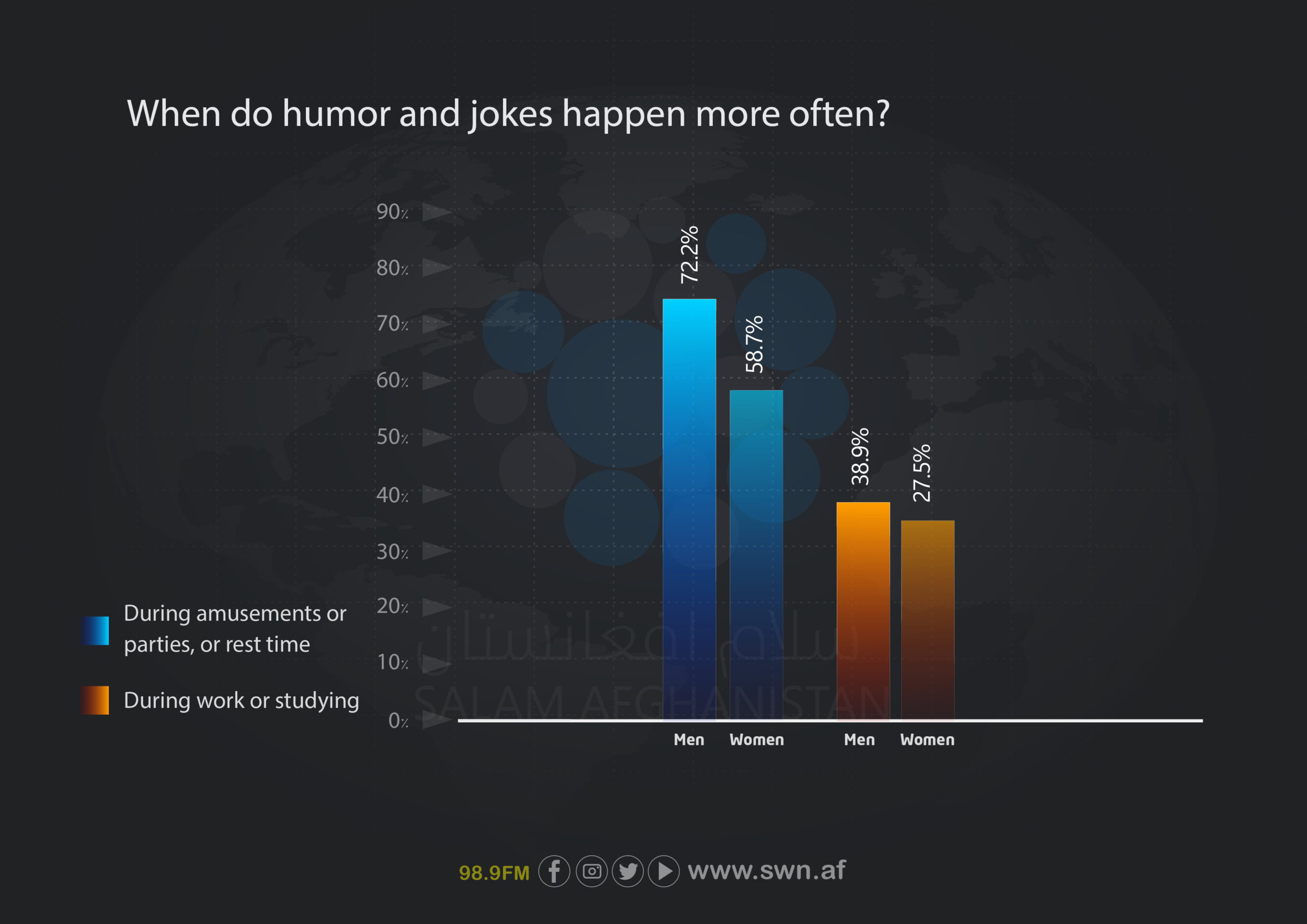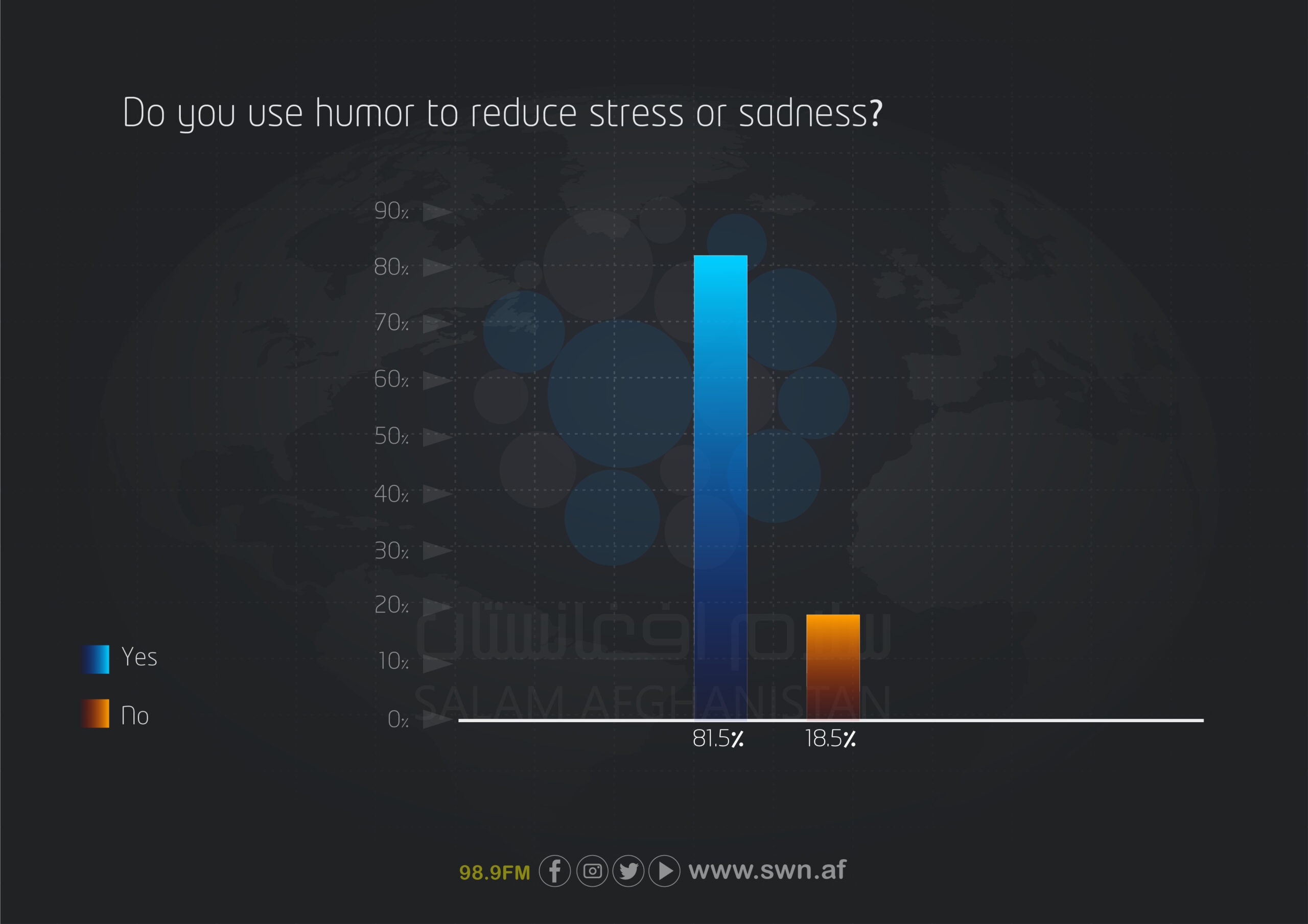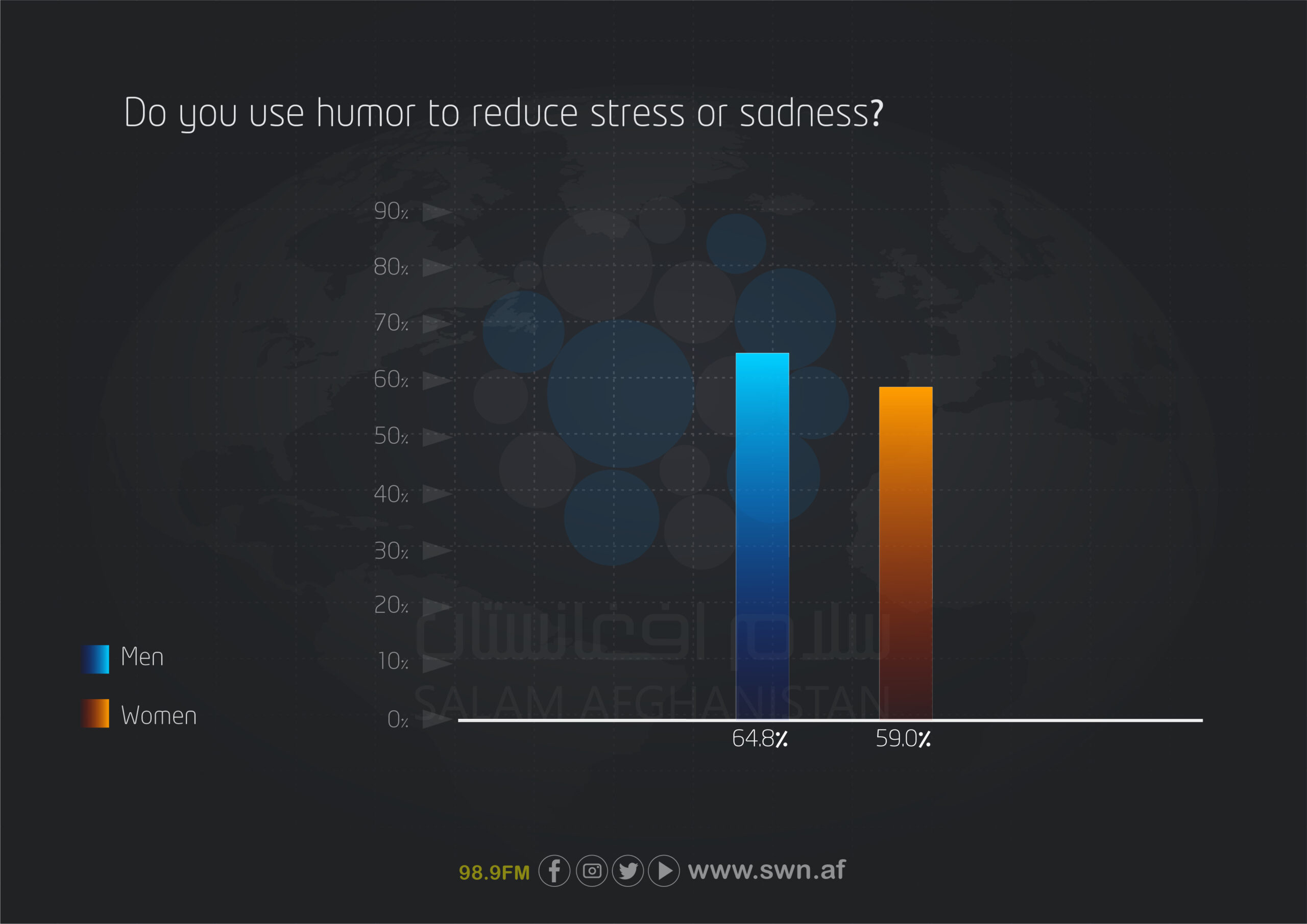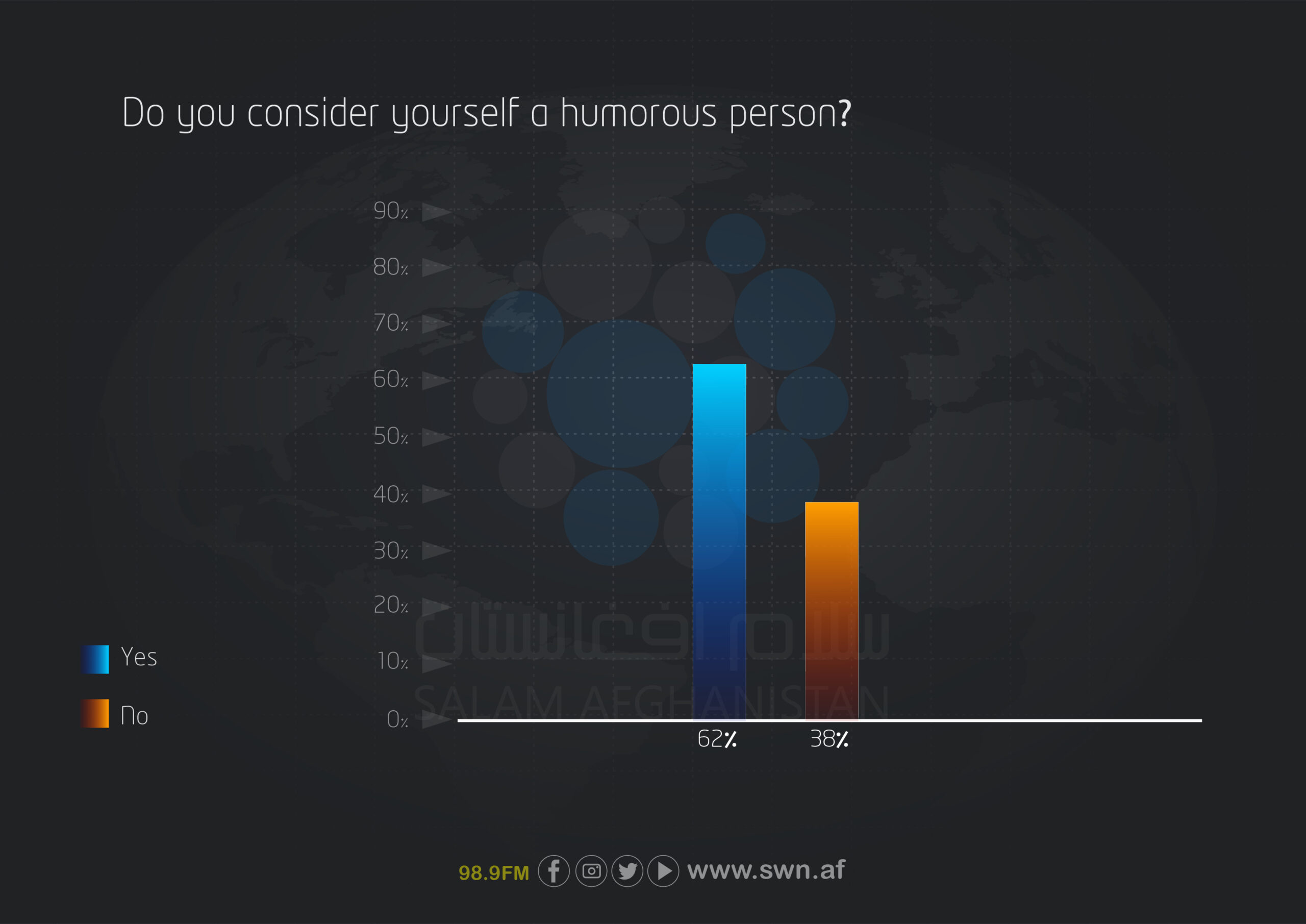 This national survey was conducted in 2025 to assess levels of humor and happiness among youths aged 18 to 35 in Afghanistan. The findings indicate that 62% of young respondents consider themselves humorous, and 81.5% use humor to reduce stress.
