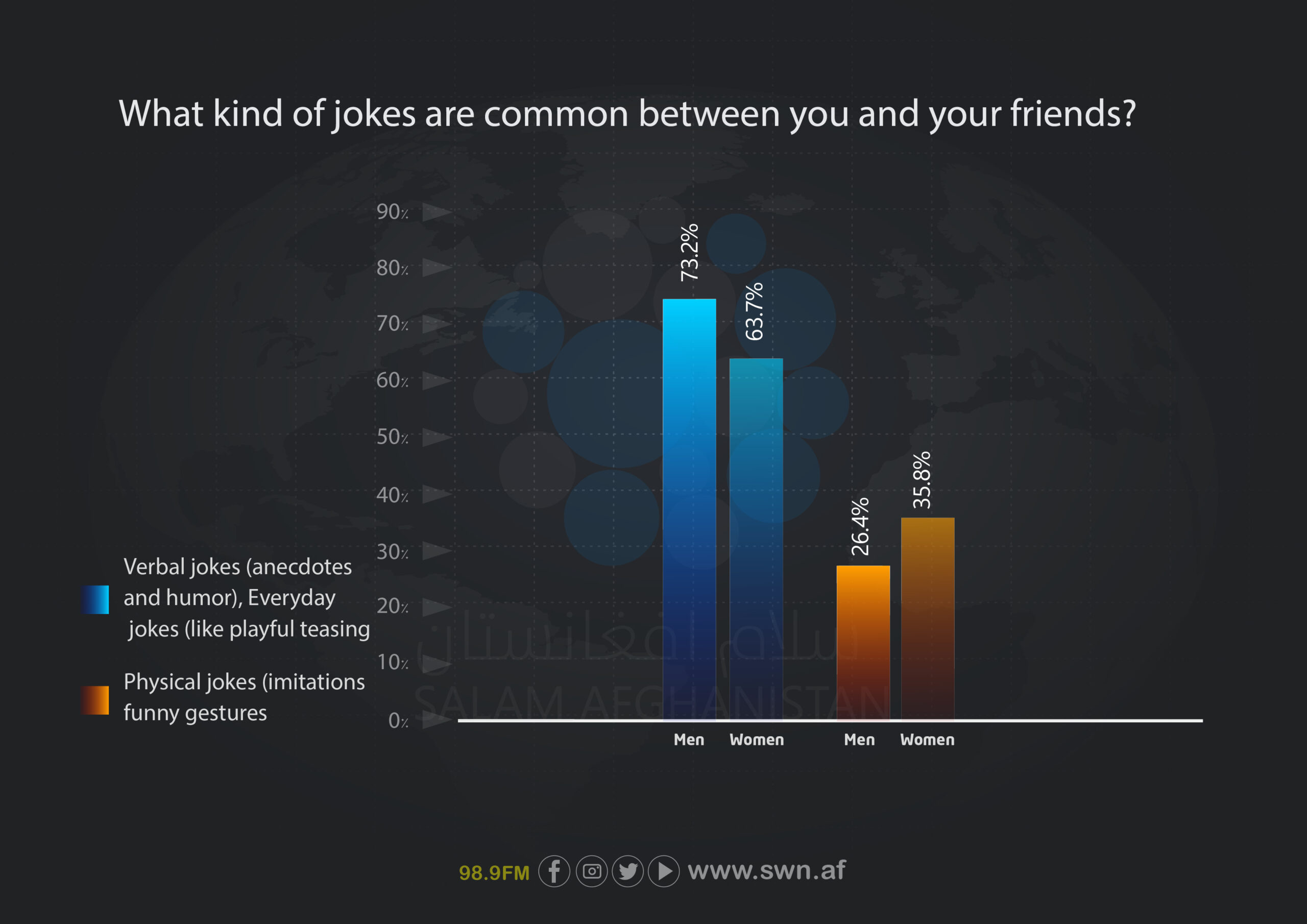 - Prevalence of verbal humor: More than two-thirds of respondents prefer verbal humor, highlighting the importance of language and oral traditions in Afghan society.