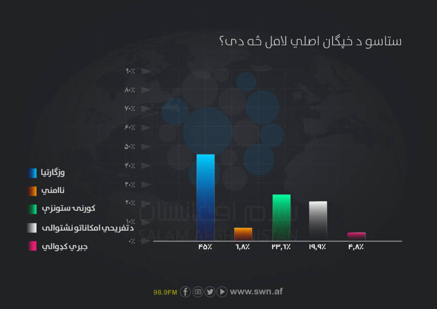 په سروې کې د دې ځوانانو د کارموندنې وضعیت هم وڅېړل شو چې ۴۲ سلنه یې اوزګاره، ۳۴.۴ سلنه یې کارمندان او ۲۳.۶ سلنه یې زده‌کونکي وو.