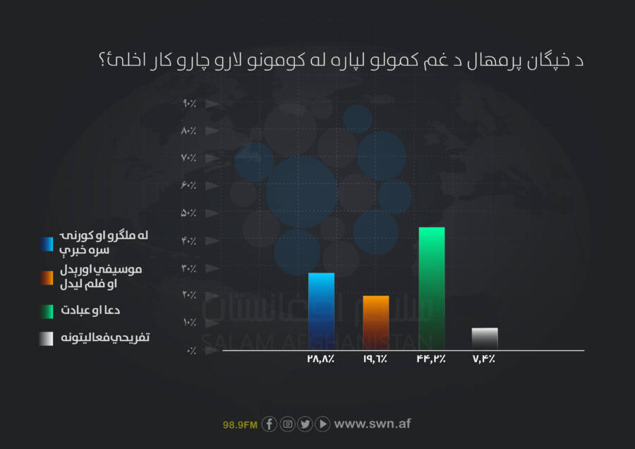 د خفګان د احساس کمولو لپاره، ۴۴.۲ سلنه ځوانان لمونځ یا عبادت ته مخه کوي، ۲۸.۸ سلنه له ملګرو یا کورنۍ سره خبرې کوي، ۱۹.۶ سلنه موسیقي اوري یا فلمونه ګوري او ۷.۴ سلنه په تفریحي فعالیتونو کې برخه اخلي.