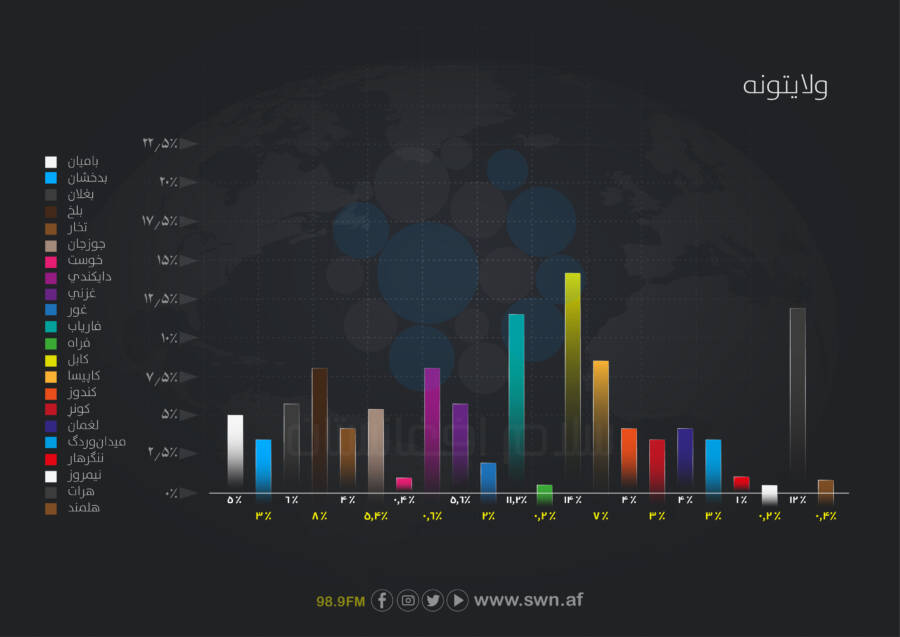 سلام‌وطندار د افغانستان په ۲۲ ولایتونو کې د ځوانانو د خوښۍ او خفګان کچې ارزولو لپاره یوه سروې ترسره کړه چې ۵۰۰ ځوانانو پکې برخه اخیستې وه. د دوی له ډلې، کابل په ۱۴ سلنه ګډونوالو سره ترټولو زیات، هرات په ۱۲ سلنه، فاریاب په ۱۱.۲ سلنه او نیمروز، فراه او هلمند په ۰.۲ سلنه مرکه شویو کسانو، تر ټولو ټیټ شمېر درلود.