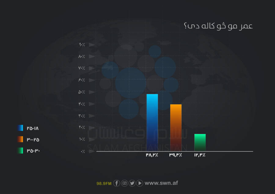 په دې سروې کې د برخه اخیستونکو له ډلې، ۴۸.۲ سلنه د ۱۸ او ۲۵ کلونو ترمنځ، ۳۹.۴ سلنه د ۲۵ او ۳۰ کلونو او ۱۲.۲ سلنه د ۳۰ او ۳۵ کلونو ترمنځ عمرونه لري.