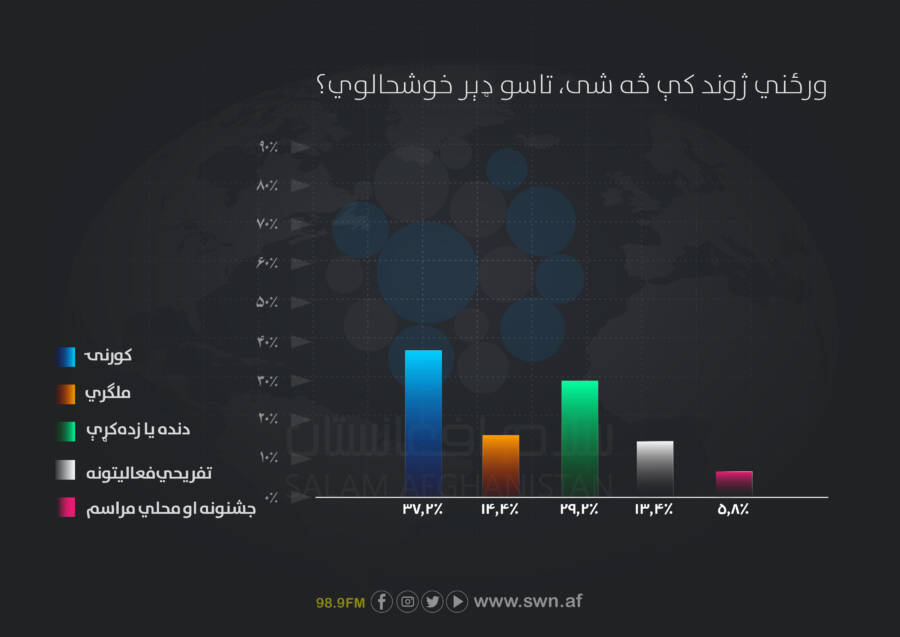د ۵۰۰ ځوانانو له ډلې چې په دې سروې کې یې برخه اخیستې وه، ۳۷.۲ سلنه یې کورنۍ، ۱۴.۴ سلنه ملګري، ۲۹.۲ سلنه دنده یا تعلیم، ۱۳.۴ سلنه تفریحي فعالیتونه او ۵.۸ سلنه جشنونه او محلي مراسم د خپلې خوښۍ لاملونه بولي.