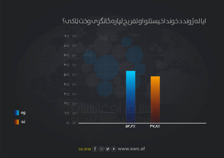 د دې ځوانانو په منځ کې، ۵۲.۲ سلنه ویلي چې دوی د تفریح ​​لپاره ځانګړی وخت لري او ۴۷.۸ سلنه نورو ویلي چې دوی د تفریح ​​یا له ژوند څخه د خوند اخیستلو لپاره ځانګړی وخت نه‌لري.