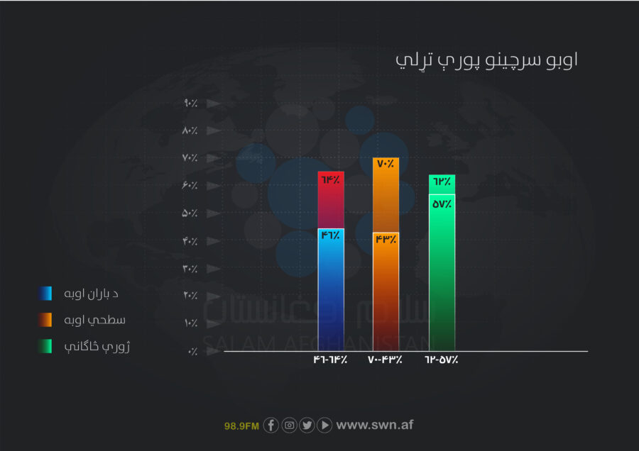 ډېری کروندګر ۷۲.۵۰٪ له سطحي اوبو کار اخلي او یوازې ۱۵٪ له ژورو یا نیمه ژورو څاهګانو ګټه پورته کوي.