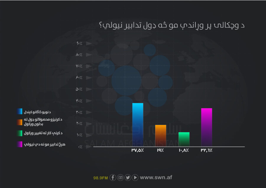 له نیمايي ډېرو کروندګرو (۶۱.۴۰٪) ویلي چې دوی د وچکالۍ پر وړاندې هېڅ ډول تدبیر نه دی نیولی. یوازې ۱۹.۳۰٪ هغو د خپلو کرنیزو محصولاتو ډولو بدل کړی او ۱۰.۵۳٪ د اوبو لپاره څاګان کیندلي دي.