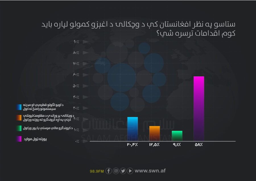 په دې توګه، افغانستان کې وچکالۍ سره مبارزه یوې جامع کړنلارې ته اړتیا لري. د اوبو لګولو سیستمونو رغولو، له کروندګرو مالي ملاتړ، د تلپاتې اوبو سرچینو ودې، کروندګرو ته روزنې ورکولو او د نړیوالو او کورنیو بنستونو ترمنځ همغږۍ په څېر حللارو ته باید لومړیتوب ورکړل شي.