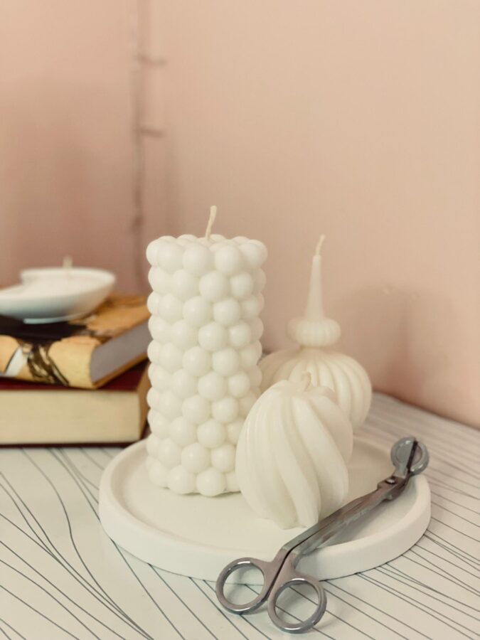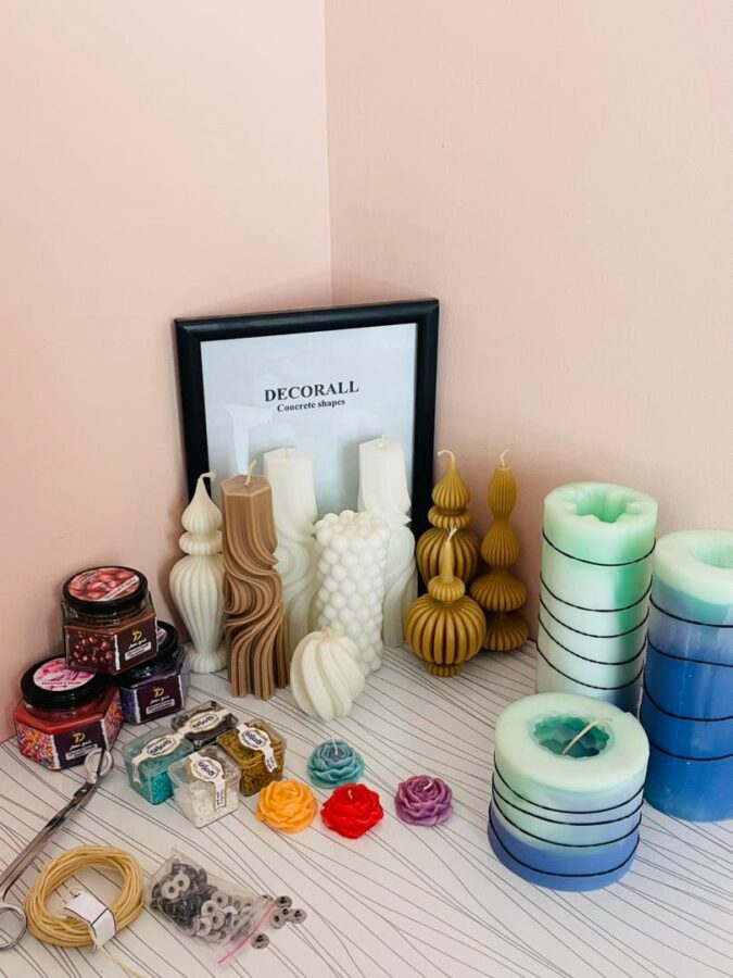 د یوې وړې کارخونې د مېز ترڅنګ ناسته ده؛ چېرې چې د هغې په لاس د جوړې شوې ډېوې نرمې لمبې د پارافین او رنګ خوږ بوی خپروي.
