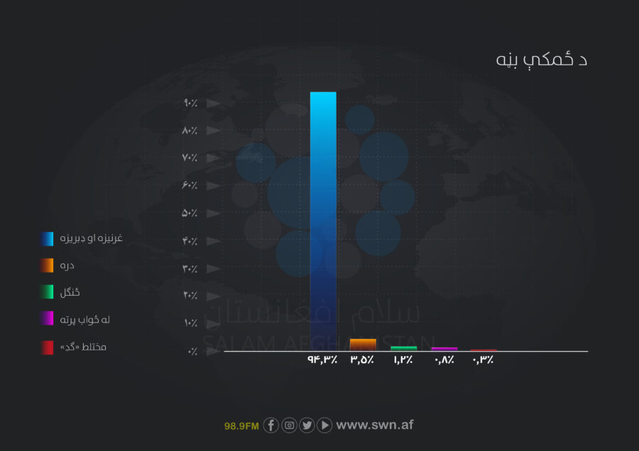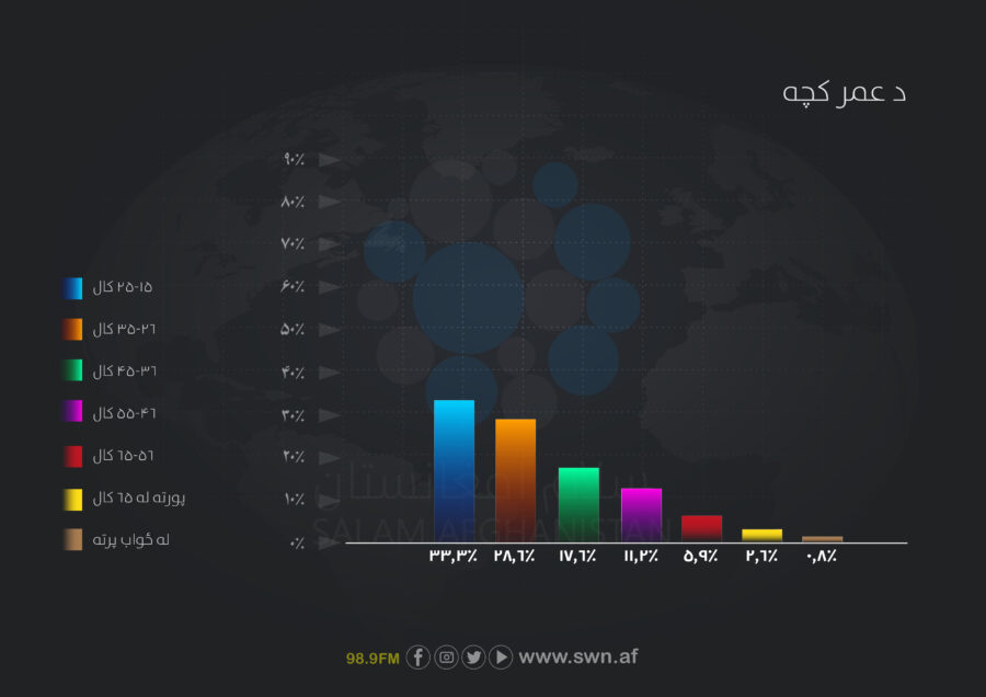 - د اومېندوارو ښځو په اړه: ۱۳.۷ سلنه «بېځوابه» او ۳.۷ سلنه «نه غواړم ځواب ورکړم»