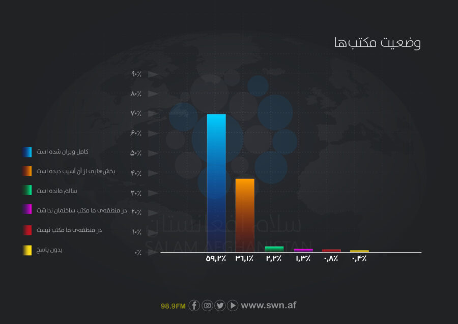 بیشتر مکتبها کامل ویران شده بودند (۶۲۸ تن، ۵۹.۲ درصد). ۳۸۳ تن (۳۶.۱ درصد) گفتند بخشهایی آسیب دیده و تنها ۲۳ تن (۲.۲ درصد) گفتند مکتب سالم داشتند.