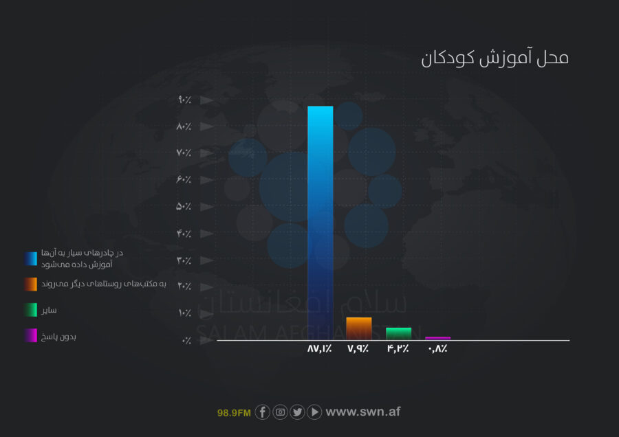 اکثریت کودکان (۹۲۴ تن، ۸۷.۱ درصد) در چادرهای سیار آموزش میدیدند. ۸۴ تن (۷.۹ درصد) به مکتبهای روستاهای دیگر میرفتند.