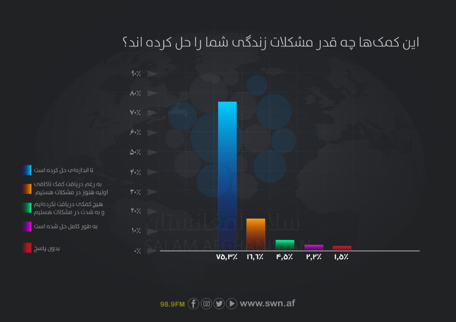 اکثریت (۷۹۹ تن، ۷۵.۳ درصد) گفتند کمکها تا اندازهای مشکلات را حل کرده است. ۱۷۶ تن (۱۶.۶ درصد) با وجود دریافت کمک ناکافی همچنان در مشکلات بودند و ۴۷ تن (۴.۵ درصد) هیچ کمکی دریافت نکرده و به شدت در مشکل بودند. تنها ۲۳ تن (۲.۲ درصد) مشکلاتشان کاملاً حل شده بود.