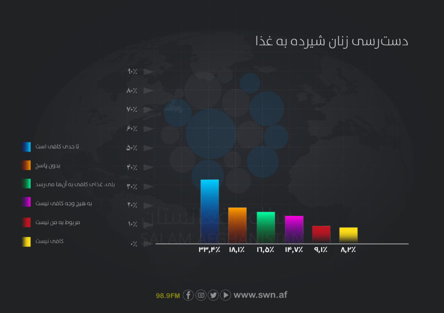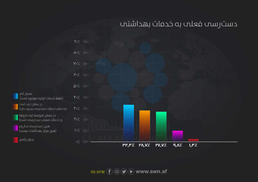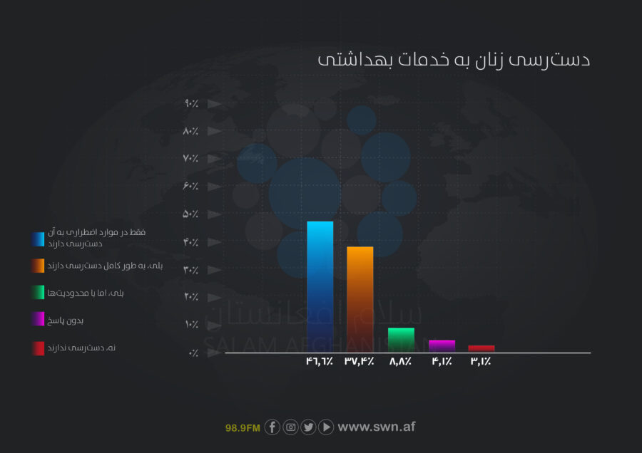 نزدیک به نیمی از پاسخدهندگان (۴۹۴ تن، ۴۶.۶ درصد) گفتند زنان فقط در موارد اضطراری به خدمات بهداشتی دسترسی دارند. ۳۹۷ تن (۳۷.۴ درصد) کامل، ۹۳ تن (۸.۸ درصد) با محدودیت و ۳۳ تن (۳.۱ درصد) هیچ دسترسی نداشتند.