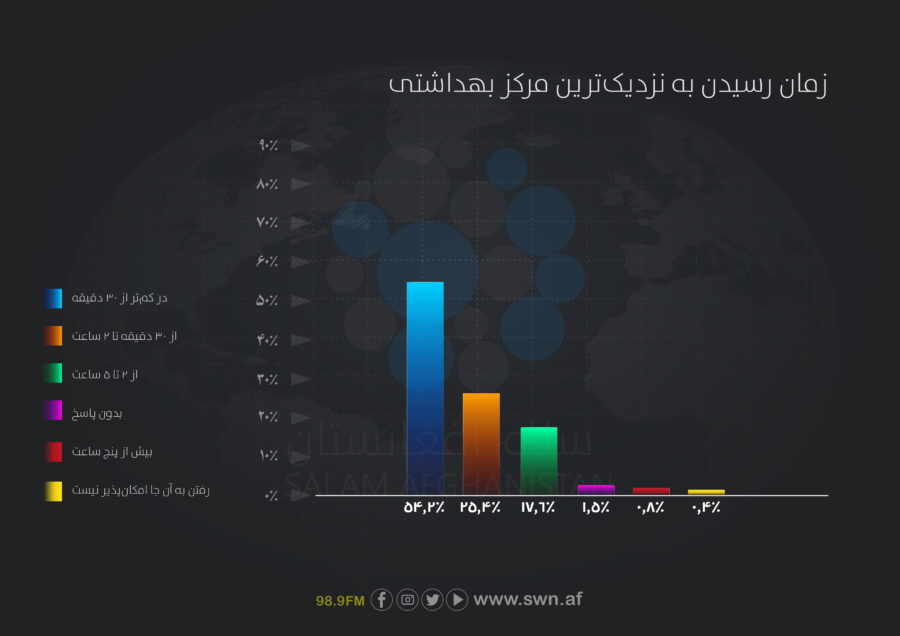 بیشتر مردم (۵۷۵ تن، ۵۴.۲ درصد) در کمتر از ۳۰ دقیقه، ۲۷۰ تن (۲۵.۴ درصد) از ۳۰ دقیقه تا ۲ ساعت و ۱۸۷ تن (۱۷.۶ درصد) از ۲ تا ۵ ساعت به مرکز بهداشتی میرسیدند.