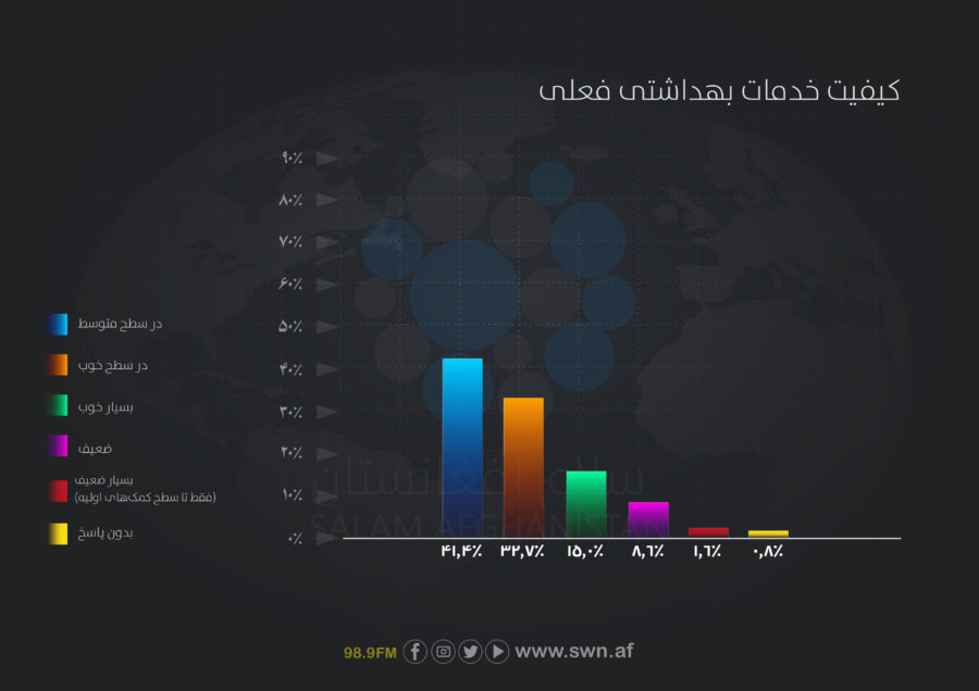 کیفیت خدمات بیشتر متوسط بود (۴۳۹ تن، ۴۱.۴ درصد). ۳۴۷ تن (۳۲.۷ درصد) خوب، ۱۵۹ تن (۱۵.۰ درصد) بسیار خوب و ۹۱ تن (۸.۶ درصد) ضعیف ارزیابی کردند.