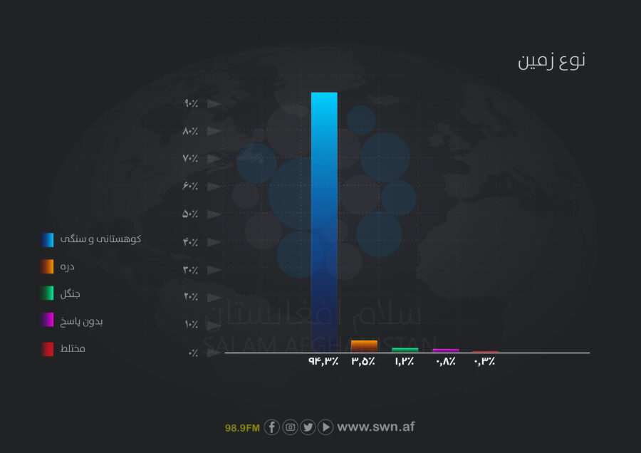 اکثریت قریب به اتفاق منطقه (۱۰۰۰ تن، ۹۴.۳ درصد) کوهستانی و سنگی بود. تنها ۳۷ تن (۳.۵ درصد) در دره و ۱۳ تن (۱.۲ درصد) در جنگل زندگی میکردند.