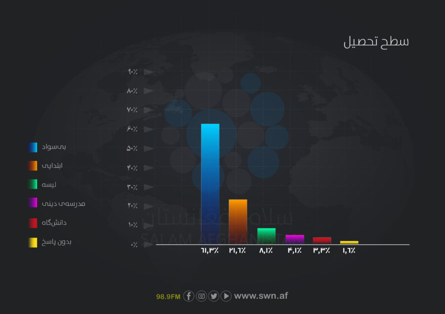 بیشتر پاسخدهندگان بیسواد بودند (۶۵۰ تن، ۶۱.۳ درصد). ۲۲۹ تن (۲۱.۶ درصد) تحصیلات ابتدایی، ۸۶ تن (۸.۱ درصد) لیسه، ۴۴ تن (۴.۱ درصد) مدرسهی دینی و تنها ۳۵ تن (۳.۳ درصد) تحصیلات دانشگاهی داشتند.