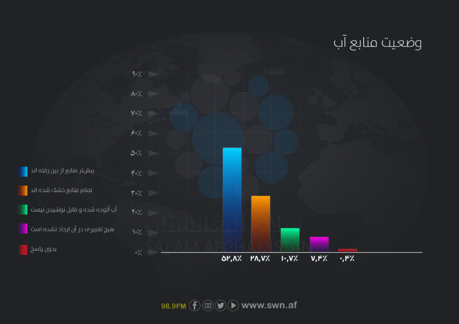 وضعیت آبی در منطقه بسیار بحرانی بود. ۵۶۰ تن (۵۲.۸ درصد) گفتند بیشتر منابع آب از بین رفته، ۳۰۴ تن (۲۸.۷ درصد) گفتند تمام منابع آب خشک شده و ۱۱۴ تن (۱۰.۷ درصد) گفتند آب آلوده و غیرقابل نوشیدن شده است. تنها ۷۹ تن (۷.۴ درصد) تغییری در منابع آب نداشتند.