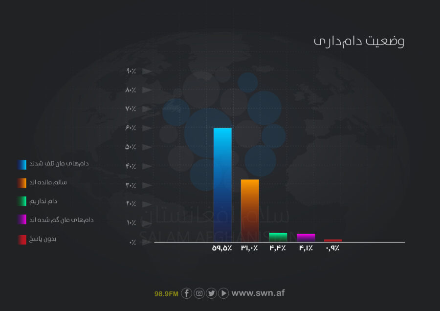 بیشتر دامها تلف شدند (۶۳۱ تن، ۵۹.۵ درصد). ۳۲۹ تن (۳۱.۰ درصد) دامهای سالم، ۴۴ تن (۴.۱ درصد) دام گمشده و ۴۷ تن (۴.۴ درصد) دام نداشتند.