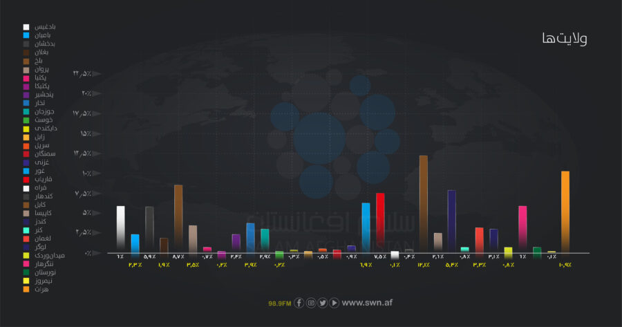 در این نظرسنجی، ۱۰۴۵ زن از ۲۹ ولایت افغانستان شرکت کرده اند که سهم کابل با ۱۲.۱درصد (۱۲۶ تن)، بیشترین اشتراککننده را دارد. پس از آن، هرات با ۱۰.۹درصد (۱۱۴ تن) و بلخ با ۸.۷درصد (۹۱ تن) قرار دارند. ولایتهای فراه و نیمروز با سهم کمتر از سه درصد، کمترین شمار اشتراککننده را داشته اند.