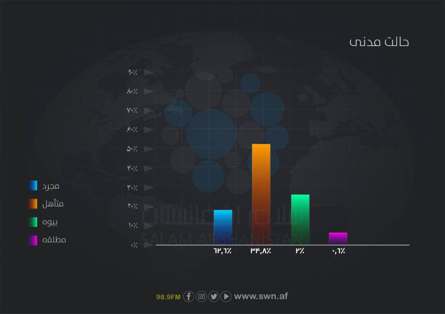 در این نظرسنجی، بیشتر پاسخدهندگان مجرد که (۶۲.۶ درصد) را تشکیل میدهند، در حالی که ۳۴.۸درصد متأهل و تنها دو درصد بیوه و ۰.۶ درصد مطلقه بودند. این آمار نشان میدهد که زنان مجرد سهم بزرگی از جامعهی هدف را تشکیل میدهد و حالت مدنی میتواند بر الگوی مصرف و تصمیمگیری اقتصادی زنان تأثیرگذار باشد.