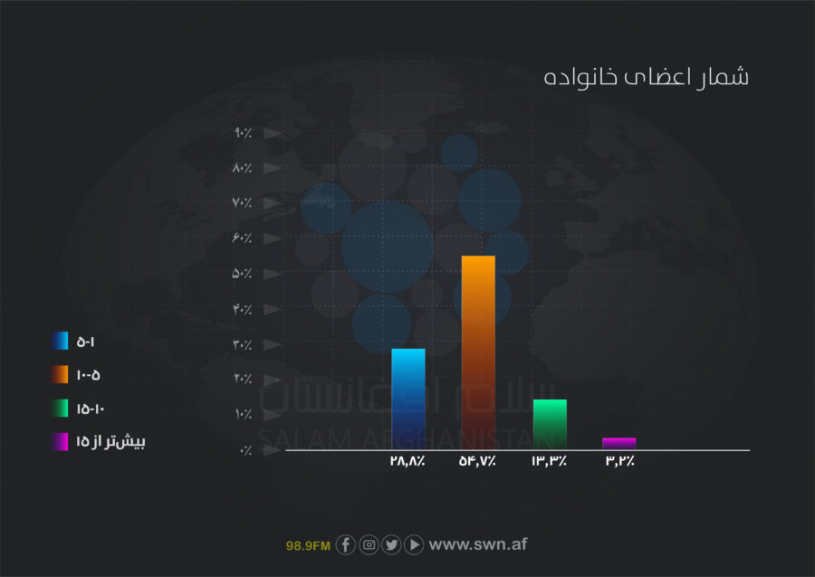 بیشترین سهم پاسخدهندگان با ۵۴.۷درصد را خانوادههایی با ۵ تا ۱۰ عضو دارند. ۲۸.۸درصد خانوادههای کوچکتر (۱ تا ۵ تن) و ۱۳.۳درصد خانوادههای بزرگتر (۱۰ تا ۱۵ تن) و تنها ۳.۲درصد خانوادههایی با بیش از ۱۵ عضو هستند. این دادهها نشاندهندهی تنوع اندازهی خانوادهها در جامعهی هدف است.