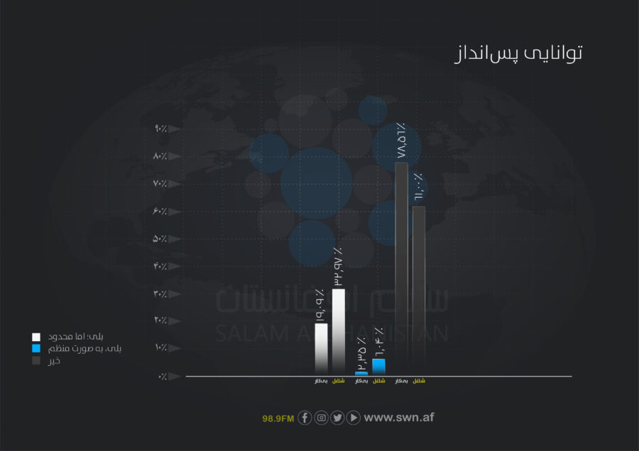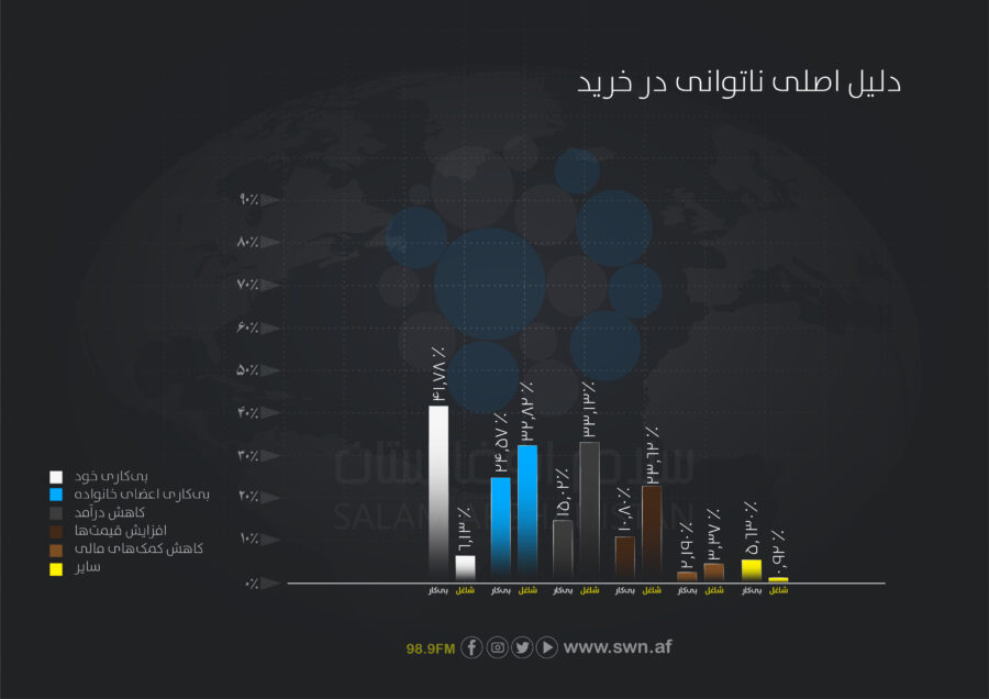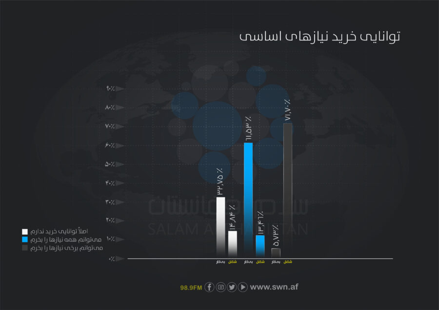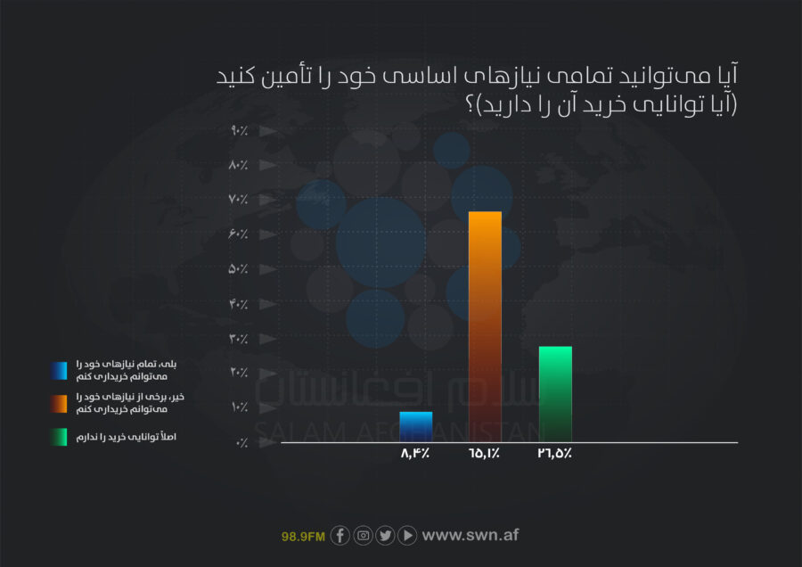 - نزدیک به ۲۶.۵درصد پاسخدهندگان اصلاً توانایی خرید ندارند و ۶۵.۱درصد تنها برخی از نیازهای خود را تأمین میکنند. تنها ۸.۴درصد قادر اند تمام نیازهای شان را خریداری کنند.