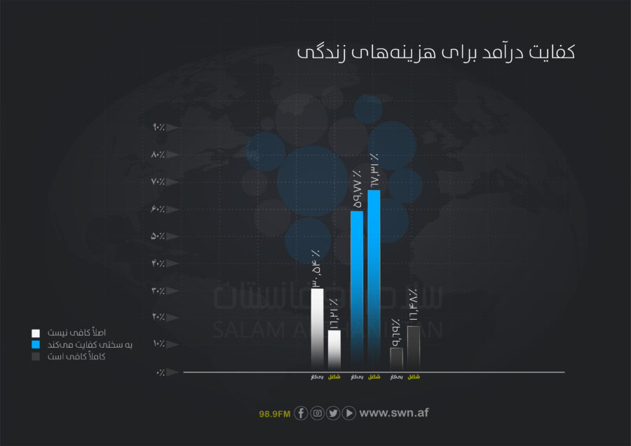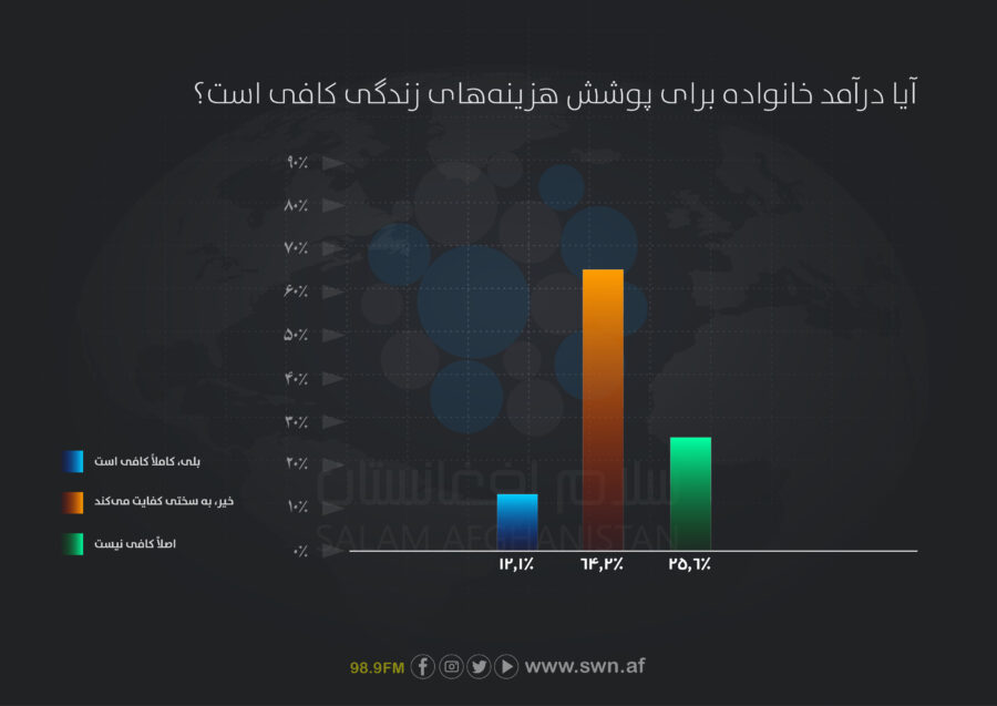 از میان زنان اشتراککننده در نظرسنجی، ۸۹.۸درصد از پاسخدهندگان اعلام کرده اند که درآمد خانوادههای شان برای پوشش هزینههای زندگی کافی نیست که شامل ۶۴.۲درصد که گزینهی «به سختی کفایت میکند» و ۲۵.۶درصد دیگر گزینهی «اصلاً کافی نیست» را برگزیده اند و تنها ۱۲.۱درصد درآمد شان کاملاً کافی است. این نشاندهندهی فشار اقتصادی شدید بر خانوادهها است.