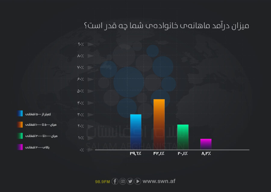 بر اساس نتایج نظرسنجی، نزدیک به ۷۲درصد خانوادهها درآمد ماهانهای کمتر از ۱۰ هزار افغانی دارند؛ حدود ۲۰درصد خانوادهها درآمد ماهانهای میان ۱۰ هزار تا ۲۰ هزار افغانی دارند و تنها ۸.۲درصد درآمد شان بالای ۲۰ هزار افغانی است. این ارقام، نشاندهندهی محدودیتهای اقتصادی گسترده و درآمدهای پایین در بخش عمدهی خانوادههای شرکتکننده در نظرسنجی است.