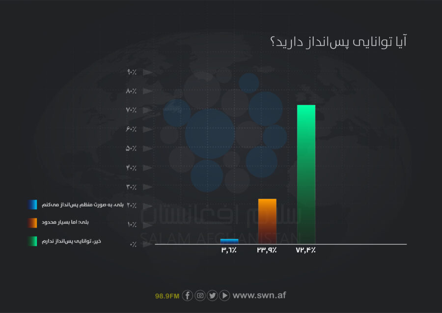 نتایج نظرسنجی نشان میدهد که ۷۲.۴درصد از پاسخدهندگان هیچ گونه توانایی پسانداز ندارند. تنها ۳.۶درصد گفته اند که به صورت منظم پسانداز میکنند و ۲۳.۹درصد نیز به طور بسیار محدود قادر به پسانداز هستند. این آمار بیانگر فشار مالی شدید و نبود ظرفیت برای ذخیرهسازی مالی در میان بیشتر خانوادهها است.