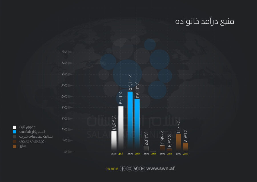 بیش از نصف خانوادهها (۵۲.۵ درصد) درآمد شان را از کسبوکار شخصی تأمین میکنند. حدود یکچهارم (۲۶.۳ درصد) حقوق ثابت دریافت میکنند. کمکهای خارجی و خیریهها نقش کمتری دارند و تنها کمتر از ۸درصد سهم دارند. این نشان میدهد که خانوادهها بیشتر به فعالیتهای شخصی برای درآمد وابسته اند.
