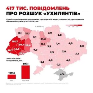 معلوماتلر گه کوره، اوکراین حربی خذمتیدن قاچهیاتگنلر سانی اېنگ کوپ اوشبو مملکتنینگ غربی حدودلریده قید ایتیلگن. یېتکرمهلرنینگ معلوماتی گه کوره، خصوصاً ۴۱۷ مینگ حربی قاچقیننینگ یریمی لویو، ترنوپیل و ایوانو-فرانکیفسک ولایتلریده استقامت قیلووچی اهالی حسابلنهدی. قالگن ولایتلرده بو کورستکیچ بیر نیچه برابر پست. مثلاً کییف و اودسا ولایتلریده حربی خذمتدن بویین تاولهگنلر لیو ولایتیگه قرهگنده ۱۰ برابر کم بولیشی تأکیدلنگن.