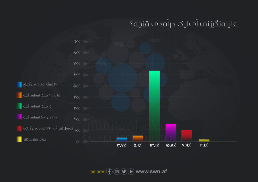 سوراو گه اشتراک ایتگنلردن آیلیک درآمدلری حقیده سورهلگن – اقتصاد حیات احتیاجلرینی تأمینلشده اینگ مهم. اولر آرهسیده ۶۳.۱ فایز ۱۱۳۶ کیشینی اوز ایچیگه آلهدی، آیلیک درآمدی ۱۵ مینگ افغانی و ۱۵.۸ فایز ۲۸۶ کیشینی اوز ایچیگه آلهدی ۲۱۰۰ دن ۵۰۰۰ افغانی درآمدی بولگن. عینحالده، جواب قیترگنلرنینگ ۹.۹ فایزی ۱۷۹ کیشینی اوز ایچیگه آلهدی ۲۱۰۰ افغانی آیلیک درآمد بیلن حیات کیچیرماقده و بو ایسه کمبغللیکنی کورستهدی. ۵.۱ فایز ۹۳ کیشینی اوز ایچیگه آلهدی ۱۵ دن ۴۰ مینگ افغانی درآمدی بار و فقط ۳.۷ فایز ۶۸ کیشینی اوز ایچیگه آلهدی ۴۰ مینگ افغانیدن آرتیق درآمدی بار.